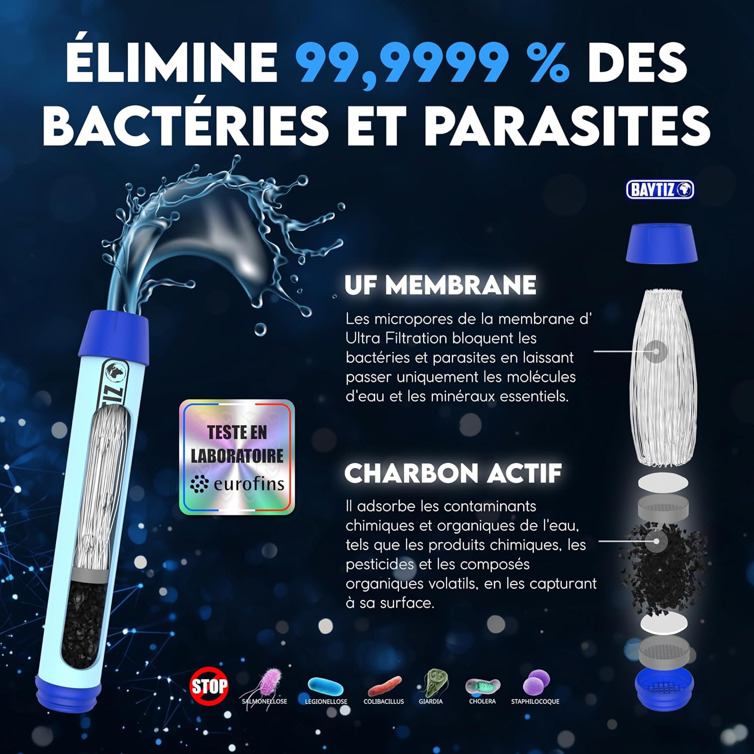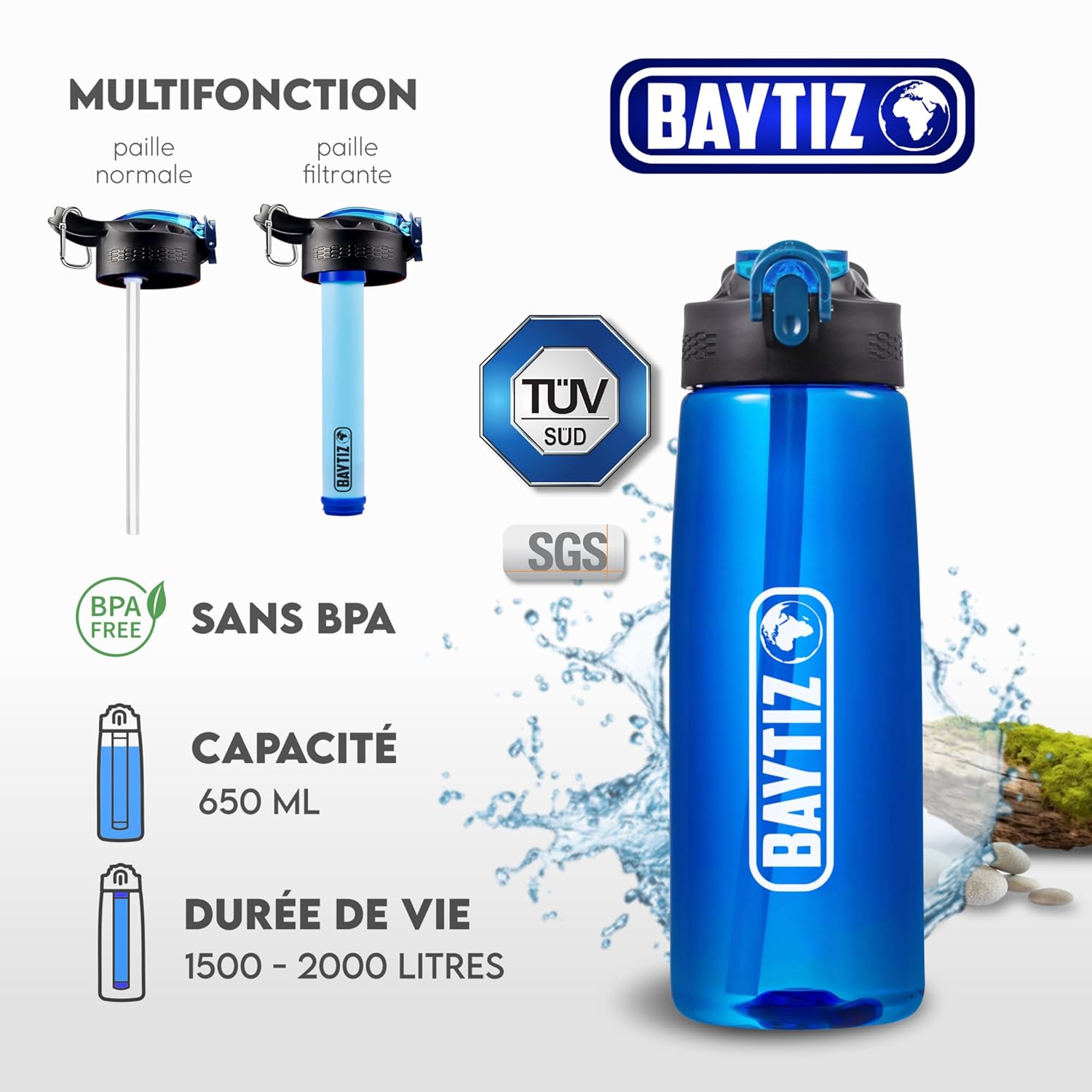 BAYTIZ ® Gourde Filtrante + Paille de Survie au Charbon Actif – Bouteille Filtre à Eau Nomade : Voyage Randonnée Trek Camping Kit Purificateur Réutilisable Plastique Sac Pluie Catastrophe