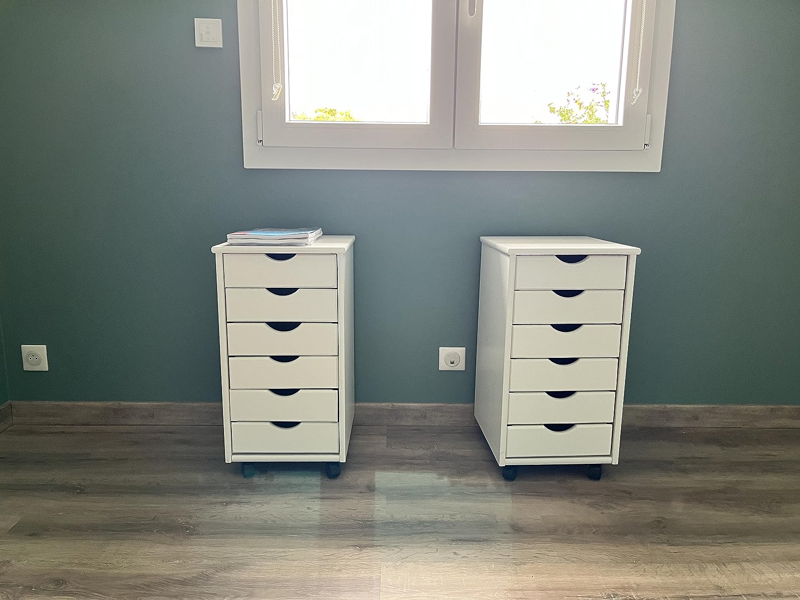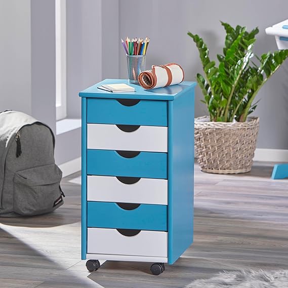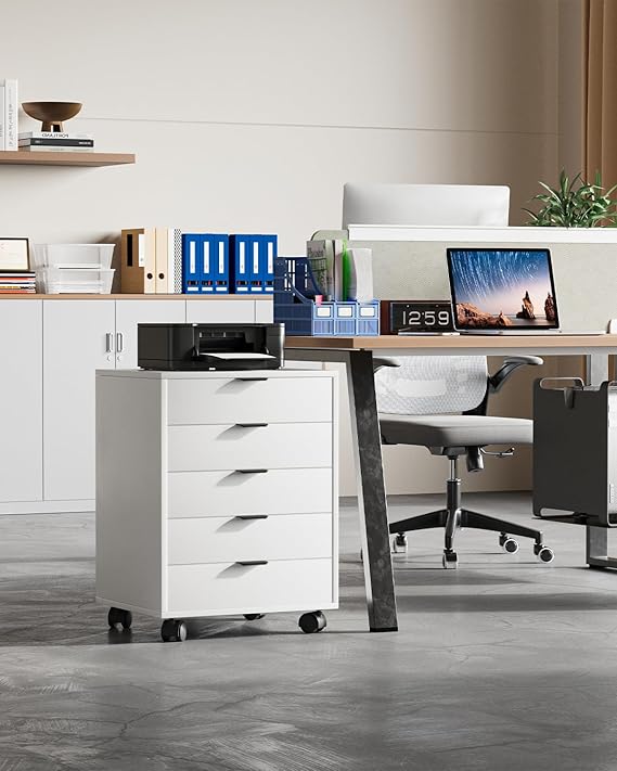 Commode de bureau à des tiroirs sur roulettes, entièrement blanche.