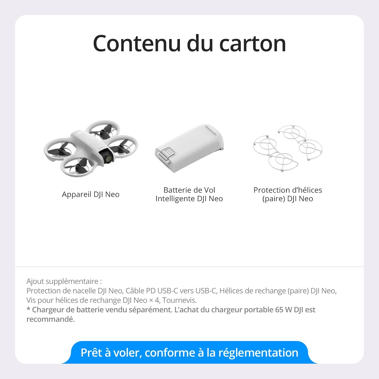• Le bundle Standard DJI Neo est livré avec une batterie, des protections d’hélices et davantage, et est prêt à être utilisé sans contrôleur ou avec un smartphone