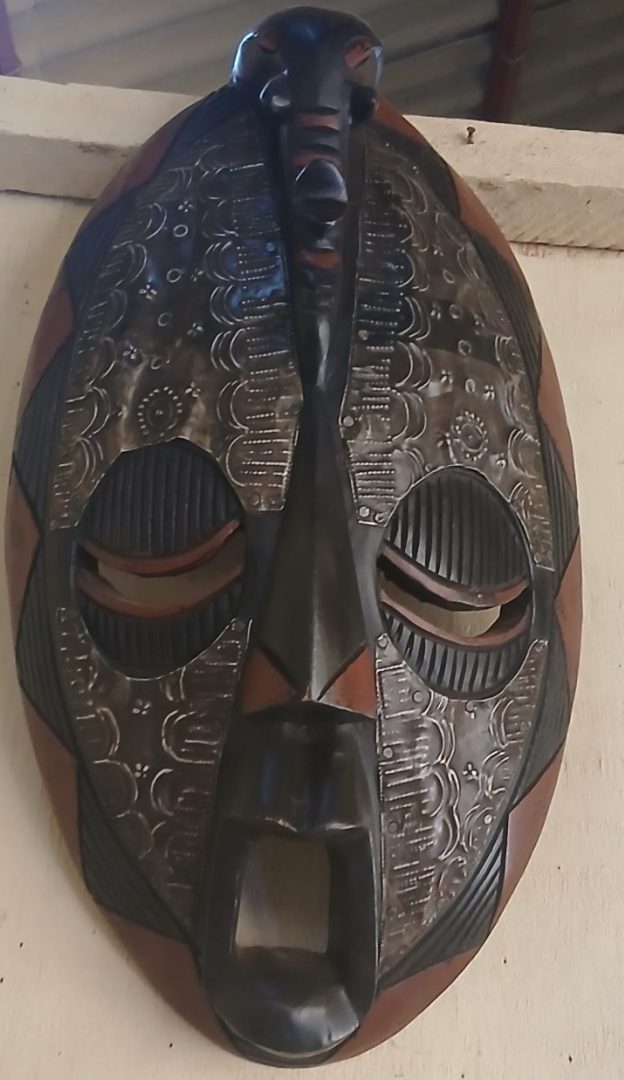 Le masque aschanti, issu de la culture Akan du Ghana, est généralement sculpté dans le bois et peut être enrichi de pigments, de métal ou de feuilles d’or, matériau emblématique du pouvoir royal aschanti. Les traits du visage sont stylisés et équilibrés : yeux en amande, nez droit, bouche fermée, exprimant calme, maîtrise et dignité. Ces masques ne sont pas de simples objets décoratifs, mais des supports de communication avec le monde spirituel et les ancêtres. Ils interviennent lors de cérémonies rituelles, funéraires ou politiques, et participent à la mise en scène de l’autorité, de l’identité collective et de la continuité entre le visible et l’invisible.