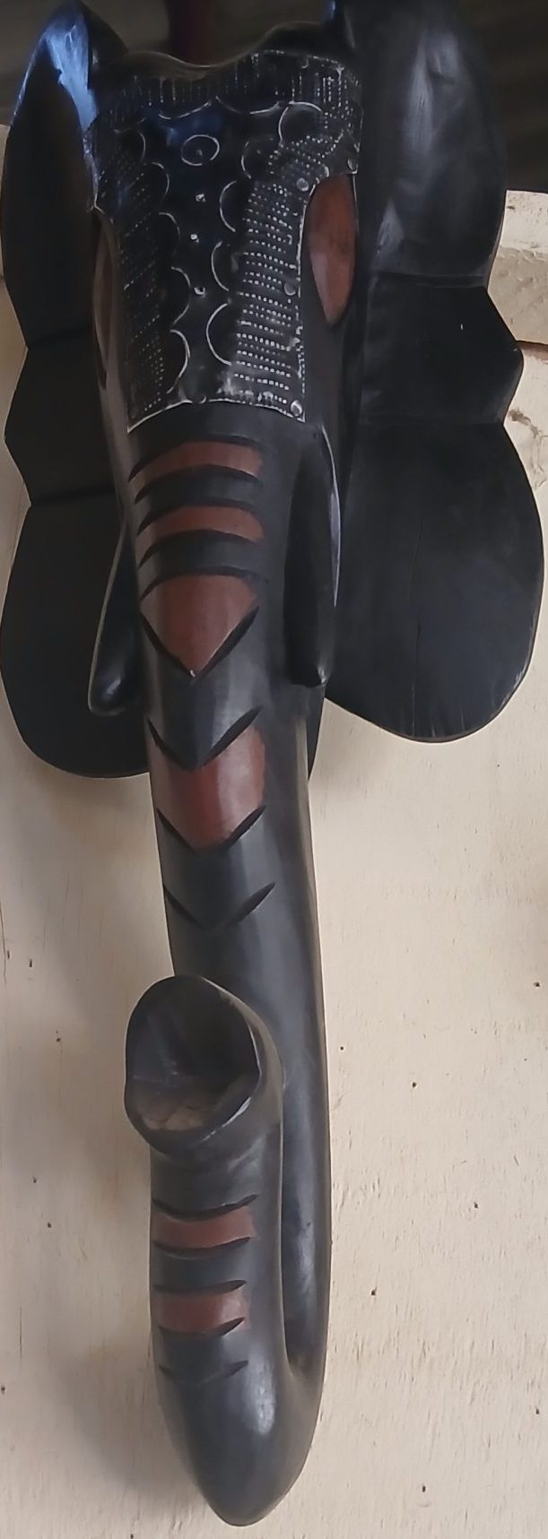 Cet objet est une sculpture en bois d’une tête d’éléphant. Il présente des couleurs sombres, principalement du noir ou du brun très foncé, avec des accents brun rougeâtre sur la trompe et les défenses, ainsi que des détails sculptés en blanc ou gris clair sur le front. La sculpture est détaillée, montrant la texture de la peau et les traits distinctifs de l’éléphant, comme ses grandes oreilles et sa longue trompe. La trompe est courbée vers le bas, se terminant par une forme qui suggère une fonction de suspension (crochet) ou de support. L’objet est conçu pour être fixé à un mur ou intégré dans un meuble, comme le suggèrent des produits similaires sur le marché. La finition semble artisanale, avec des variations de couleur et de texture .