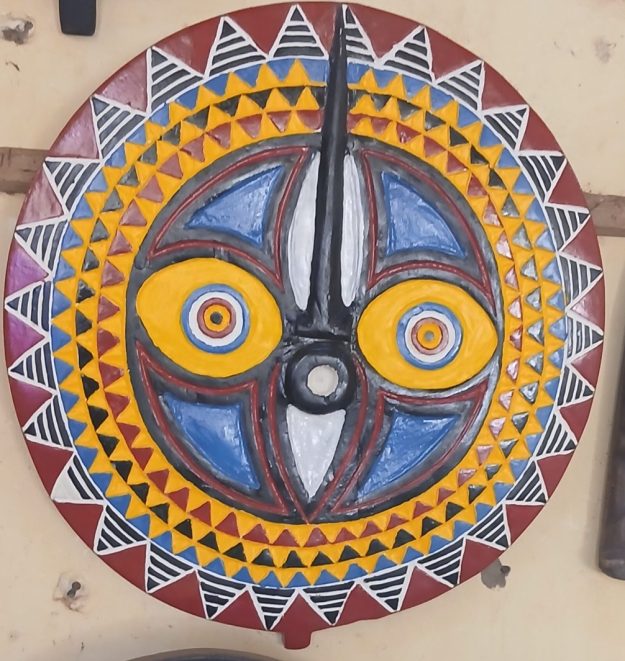 - Ces masques solaires en bois massif sont sculptés et peints à la main par des artisans qualifiés, souvent issus des tribus Bobo, qui sont des agriculteurs de l’est du Burkina Faso. Uniques dans la région de Bobo Dioulasso, ces masques sont traditionnellement utilisés dans la danse lors de cérémonies visant à protéger les familles du danger et à assurer la fertilité. Chaque pièce est unique et présente des motifs et des dimensions variés. Au-delà de leur usage rituel, ils sont également prisés comme objets de décoration intérieure, apportant une touche ethnique et artistique. Le masque supérieur présente des couleurs primaires audacieuses (rouge, jaune, bleu) avec des motifs triangulaires en dents de scie encerclant un visage aux grands yeux jaunes et une bande nasale noire. Le masque inférieur arbore un bleu intense avec des pointes blanches proéminentes et un visage plus simple, également avec des motifs concentriques pour les yeux.