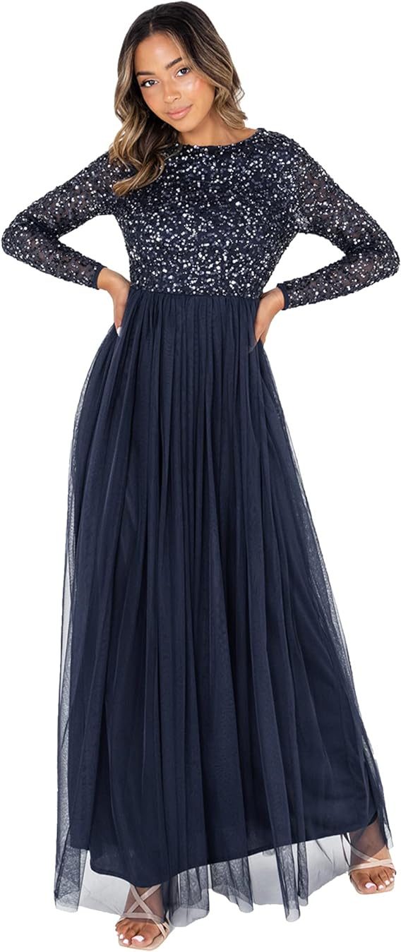 Maya Deluxe Taupe Blush Embellished Long Sleeve Maxi Dress Robe de Demoiselle d’honneur Femme ,