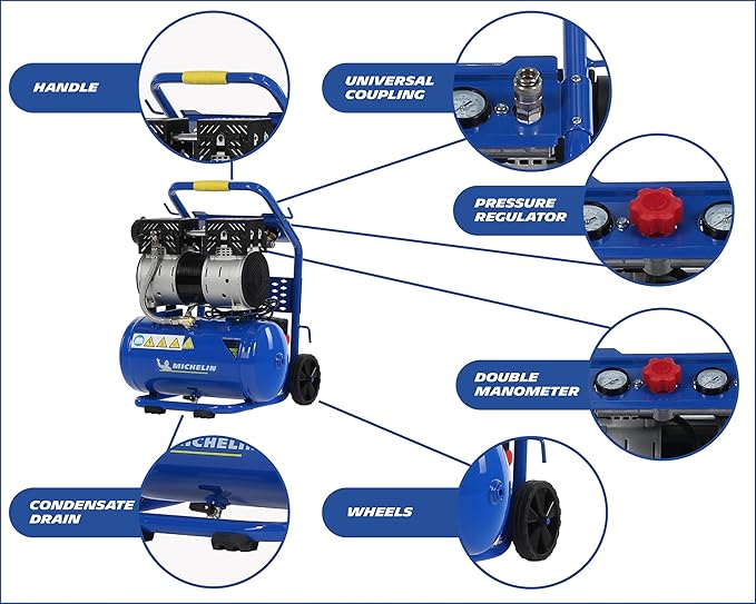 • SILENCIEUX ET PORTABLE: grâce à un niveau sonore de seulement 58 dBA et à son poids très léger, le compresseur MICHELIN MX 10/1 est parfaitement adapté à un usage domestique dans l’appartement.