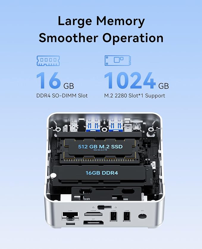 - 🚀【16 Go DDR4 + 1024 Go M.2 SSD, extension flexible】Avec 16 Go DDR4 RAM et 1024 Go de stockage SSD M.2, vous pouvez facilement basculer entre plusieurs applications, l’exécution se déroule plus facilement et sans décalage. Le SSD M.2 de 1024 Go intégré vous permet de stocker rapidement plusieurs fichiers importants et de réduire le temps de démarrage. Prend en charge le remplacement du SSD M.2 NVMe PCIe3.0 ou du SSD M.2 SATA, jusqu’à 2 To. Très approprié pour le bureau et un usage quotidien.
