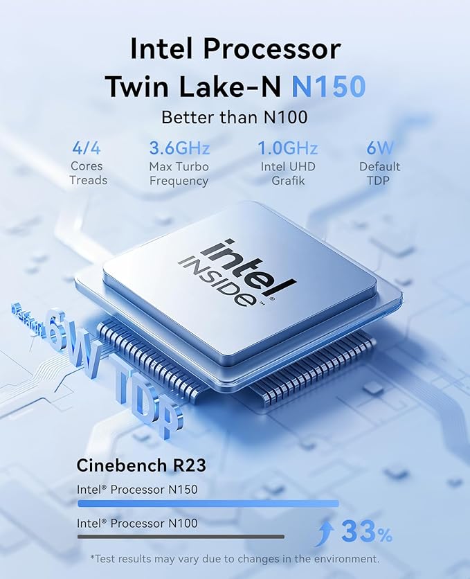 - 🚀【6 W TDP Mini PC N150】NiPoGi E2 mini PC est équipé du dernier processeur Ιntel Twin Lake N150 (jusqu’à 3,60 GHz, 4C/4T). En tant que version mise à jour du CPU-N100, il a une faible consommation de seulement 6W, ce qui est très économe en énergie. Les performances globales du CPU-N150 ont été améliorées de 6 à 10 % et le GPU a été amélioré de 27 %, vous offrant une expérience de fonctionnement plus fluide et plus efficace. Il est très approprié pour un usage quotidien au bureau et à la maison.