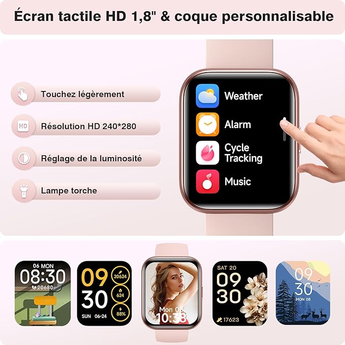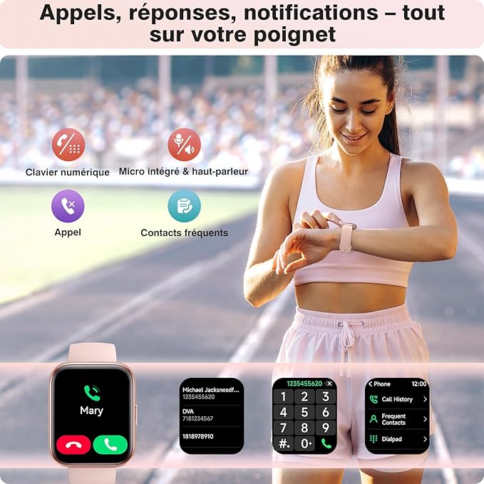 • 【Appels Bluetooth】La montre de fitness pour femmes avec appels est équipée d’une nouvelle puce BLE5.3 et de haut-parleurs haute fidélité, ce qui rend les appels plus stables et avec une qualité sonore plus claire. La smartwatch peut recevoir des alertes d’appels entrants et des alertes de messages provenant de Facebook, Instagram, SMS, Twitter, WhatsApp et d’autres applications, améliorant ainsi votre vie et votre efficacité au travail.