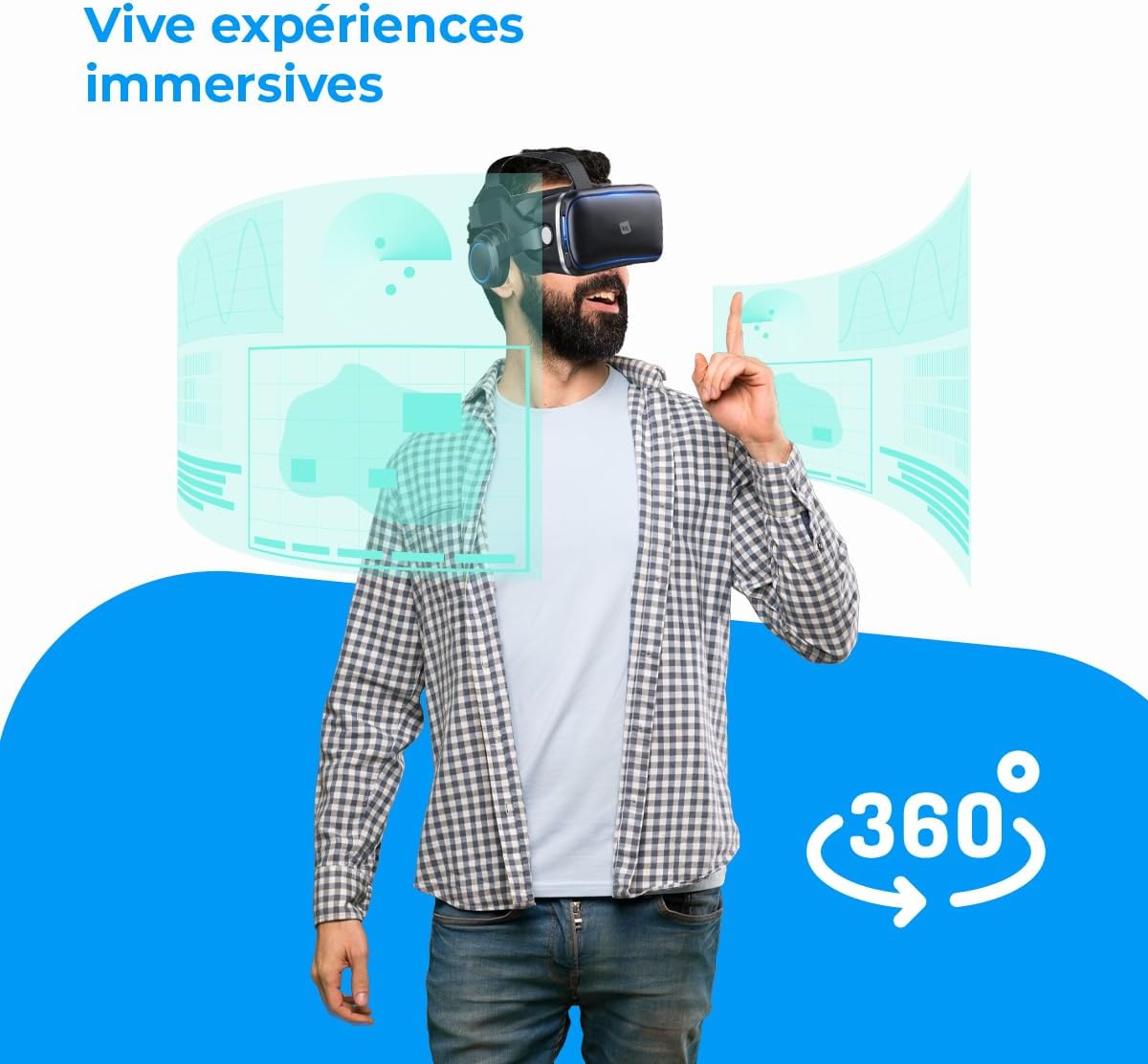 - Immersion 3D et 360 degrés: avec ces lunettes de réalité virtuelle, vous pouvez vivre dans n’importe quel monde à l’époque et à la situation que vous souhaitez. Vous pouvez même bouger et tourner à 360 degrés.