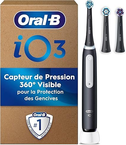 Oral-B Brosse A Dents Electrique iO 3 Noire, 3 Modes De Nettoyage Dont Blancheur, Brossage Silencieux, Capteur De Pression, 3 Brossettes De Rechange Oral B, Embouts Ronds, Chargeur, En Carton