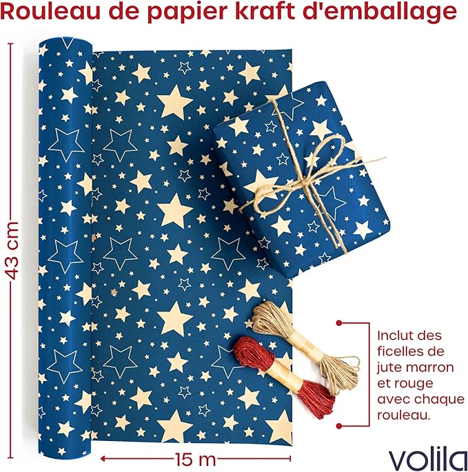 Papier Kraft Rouleau avec Design de Étoiles – 15 m x 43 cm Rouleau Papier Cadeau avec 2 Ficelles en Jute – Idéal comme Emballage Cadeau et Papier Cadeau Noël.