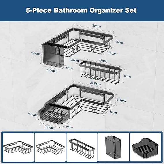 - Cinq Pièces Multifonctionnel Étagère de Salle de Bain – Créez la Solution de Rangement Idéale : Cet ensemble de rangement salle de bain pratique comprend deux grandes étagères d’angle, un panier de rangement compact, un porte-savon de douche et un porte-brosse à dents. Optimisez l’espace de la salle de bain en organisant soigneusement shampoing, gel douche, savon, boules de bain, brosses à dents, rasoirs et bien plus encore, pour une salle de bain toujours propre et bien rangée.