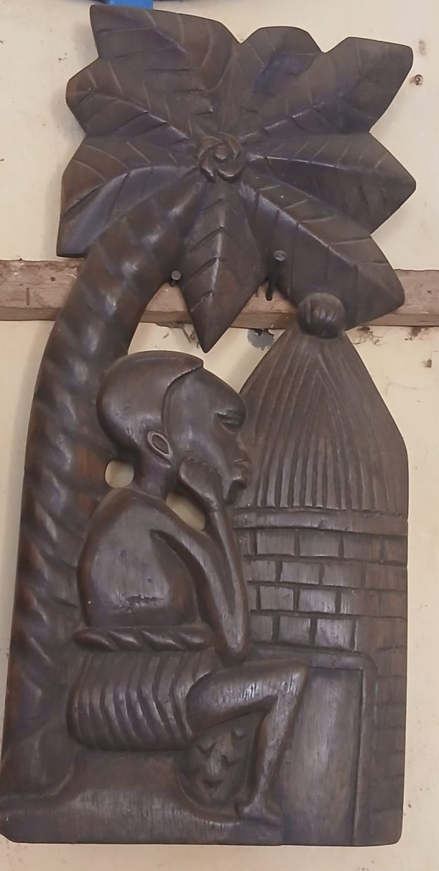 Le personnage est adossé à un tronc d’arbre courbé qui se termine par des feuilles de palmier au sommet de la sculpture. À sa droite se trouve une petite hutte ou maisonnette au toit conique et aux murs texturés comme des briques ou des roseaux.