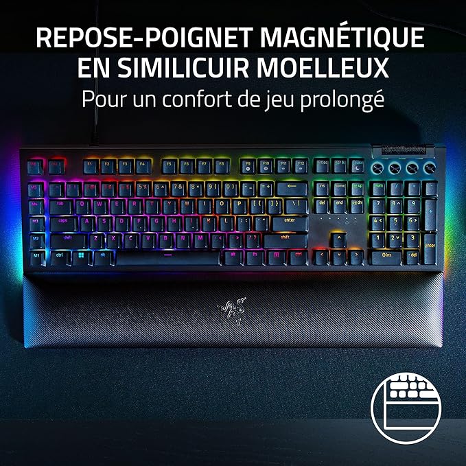 • Repose-poignet magnétique en similicuir moelleux pour un confort de jeu prolongé Avec un repose-poignet doux et rembourré qui se fixe solidement au clavier, profitez d’un confort durable qui vous aidera à tenir le coup pendant les marathons de jeu les plus intenses