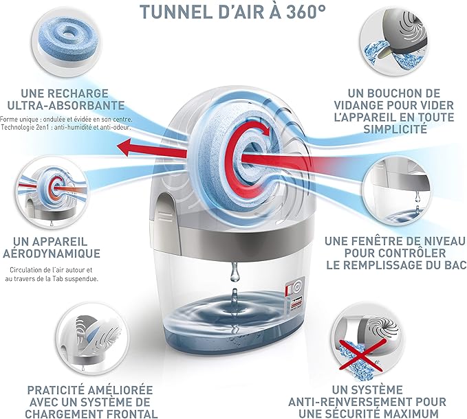 - Facile à utiliser : Solution anti-humidité avec système anti-renversement et facile à recharger, l’appareil est également doté d’un indicateur de fin de recharge pour plus de praticité.