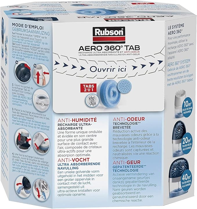 Soyez le premier à commenter “Rubson AERO 360° Recharges en tabs neutres pour absorbeur d’humidité, recharges pour déshumidificateurs AERO 360° ultra absorbantes et anti odeurs, 2 x 450 g”