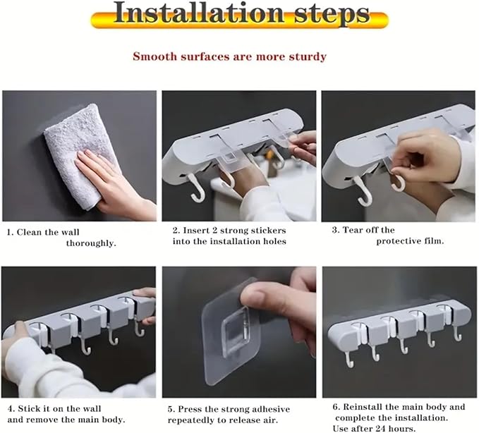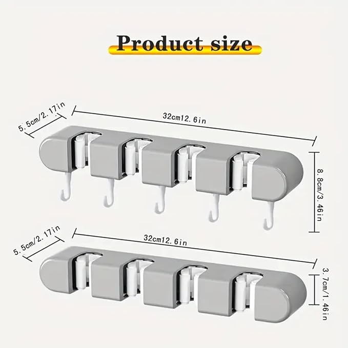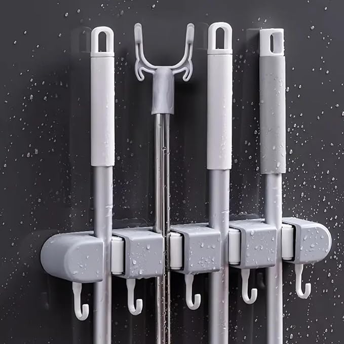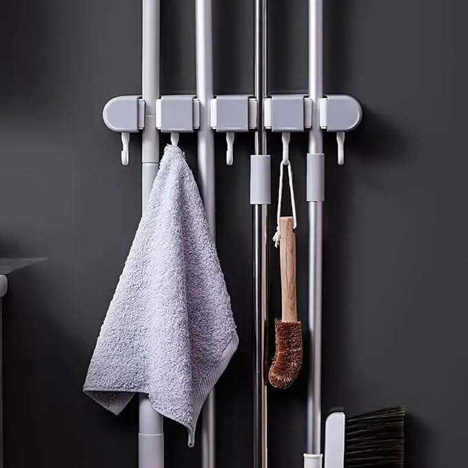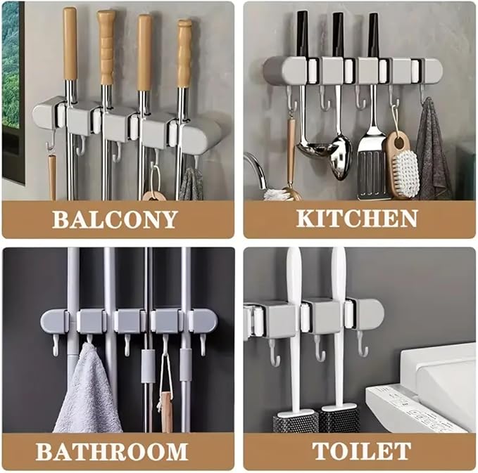 Ce support mural pour balai et serpillère est la solution idéale pour organiser efficacement vos outils de nettoyage et garder votre intérieur propre et ordonné. Grâce à son design intelligent, il dispose de 4 étagères pratiques pour ranger produits ménagers, éponges ou accessoires, ainsi que de 5 crochets robustes permettant de suspendre balais, serpillères, pelles, brosses ou autres ustensiles.