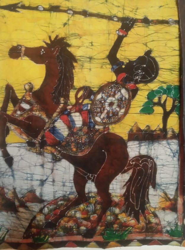 Cette œuvre représente une scène figurative richement décorée, inspirée de l’art traditionnel africain, proche du style batik. Au centre de la composition, on voit un cavalier guerrier monté sur un cheval cabré, figé dans un mouvement puissant et dynamique. Le cheval, peint dans des tons bruns profonds, est orné de harnachements détaillés aux motifs géométriques et colorés, mêlant le rouge, le bleu et le blanc. Sa posture dressée suggère la force, l’élan et la maîtrise.