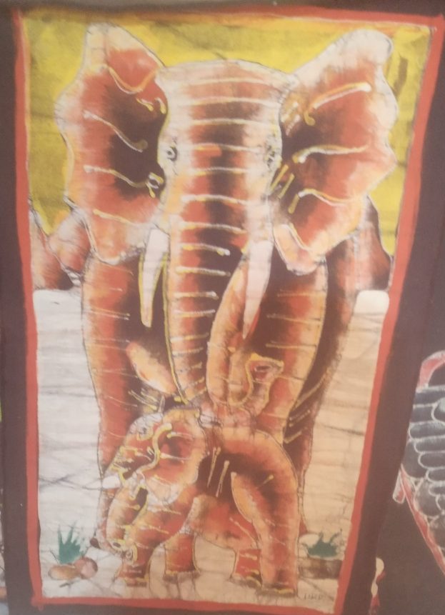 Ce tableau artisanal met en scène une majestueuse éléphante accompagnée de son éléphanteau, illustrant un puissant symbole de protection, de sagesse et de lien familial.